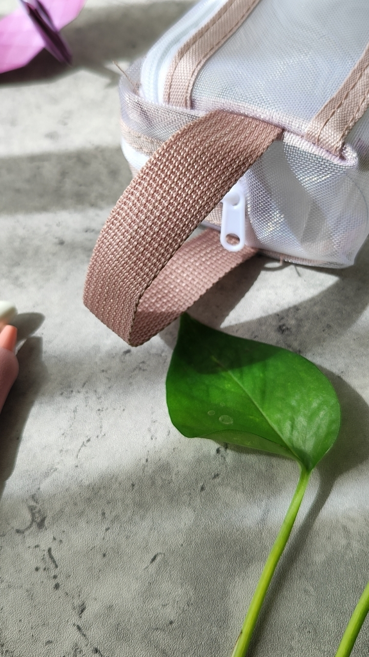 جنسش از پارچه توری هست که باعث میشه بتونی راحت داخلش رو ببینی و سریع وسایلت رو پیدا کنی و داخلش طلق داره برای اینکه فرمش رو از دست نده